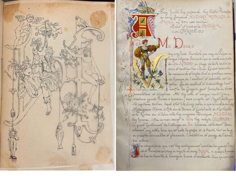 Plus que l’intérêt de Popelin pour les arts décoratifs, c’est surtout sa passion pour le livre en tant qu’objet d’art qui transparaît dans cette documentation. Grand bibliophile, Popelin s’attachait à réaliser des plats de reliures en émail pour décorer les livres qu’il offrait à ses proches. Il a également été amené à en réaliser avec son collaborateur et ami orfèvre Lucien Falize, comme cet exemplaire conservé au Walters Art Museum, dont on remarque sans peine la filiation avec certains calques issus de l’album. Pratiquant lui-même l’enluminure, la dédicace qu’il réalisa pour sa traduction de Picolpasso à la princesse Mathilde est richement décorée et rappelle elle aussi les enluminures présentes dans cet album.