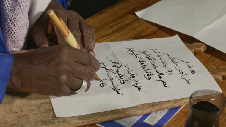 Autre temps fort du colloque : la projection, dans l’auditorium de l’INHA, du film CallFront – Récit de voyages, réalisé par Antoine Brendlen. Le cinéaste a accompagné les chercheuses et chercheurs du projet lors de plusieurs missions de terrain, donnant à voir les conditions concrètes de la recherche, les rencontres, les lieux et les objets étudiés. Tourné au Maroc, en Chine et au Sénégal, le film plonge le spectateur au cœur du travail de maîtres calligraphes gardiens des traditions calligraphiques locales : Belaïd Hamidi, Haji Noor Deen et Cheikh Hamou. En documentant la pratique de calligraphes porteurs de savoirs menacés, il donne à voir leurs gestes et leurs manuscrits, tout en soulignant la richesse des échanges entre chercheurs et calligraphes, et la diversité de leurs approches de la calligraphie. Le film offre un regard sensible et complémentaire sur l’aventure collective que représente le projet CallFront.