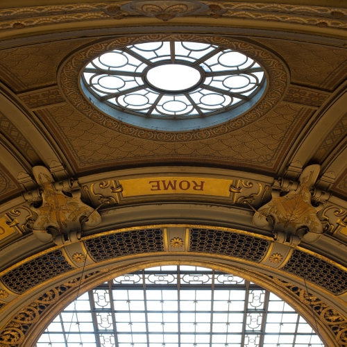 Remarquable par sa hauteur de 18 mètres, la salle Ovale est dominée par une verrière centrale entourée de seize œils-de-bœuf vitrés, utilisés jadis pour l’aération. Au-dessus de chacun d’eux sont inscrits les noms de villes importantes dans l’histoire des civilisations et des bibliothèques comme Byzance, Babylone, Jérusalem ou Pékin… Ces ouvertures circulaires surplombent seize arcades à décors de mosaïques et paires de colonnes cannelées en fonte, avec à leurs pieds, les calorifères, système de chauffage de la salle.