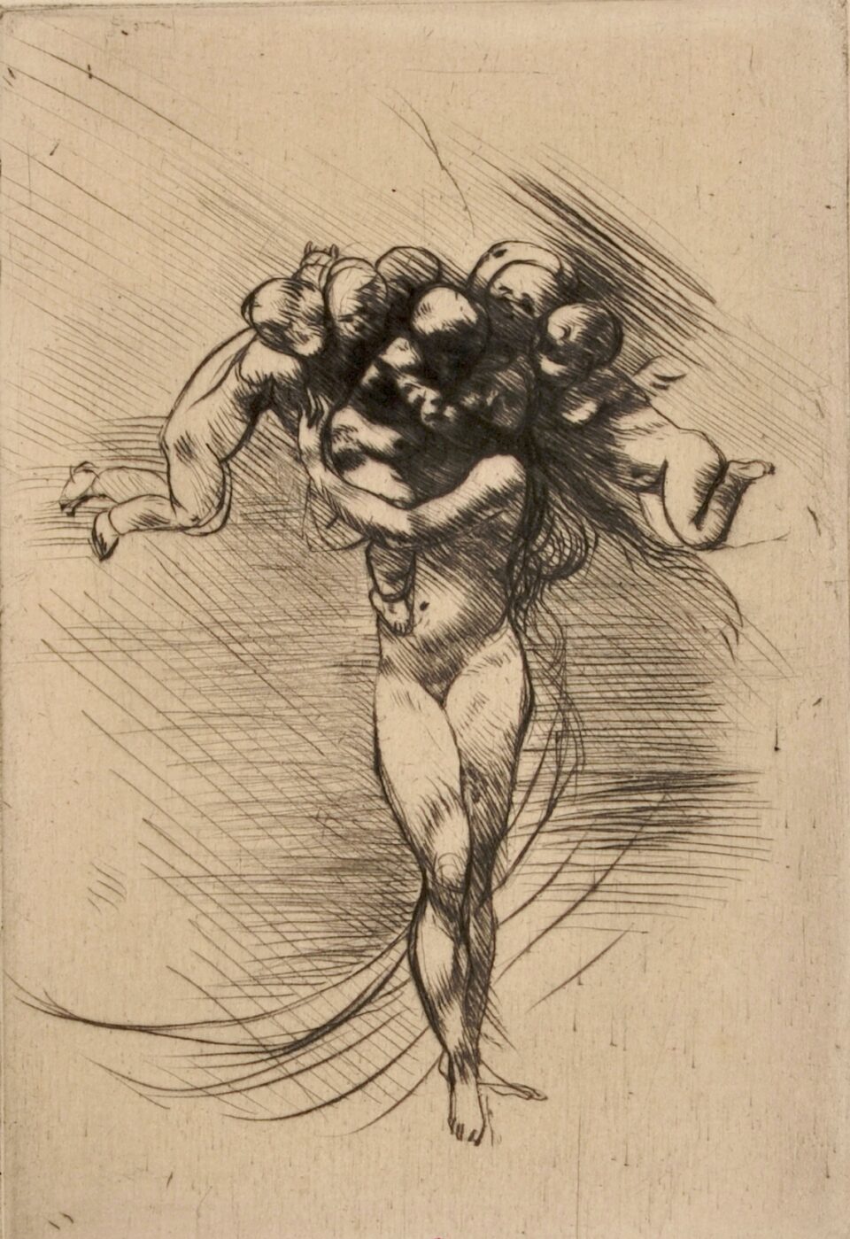 Si ses premières gravures, comme Les Amours conduisant le Monde ou Le Buste de Bellone, laissent encore transparaître l’influence de Legros, la personnalité de Rodin va rapidement s’affirmer.