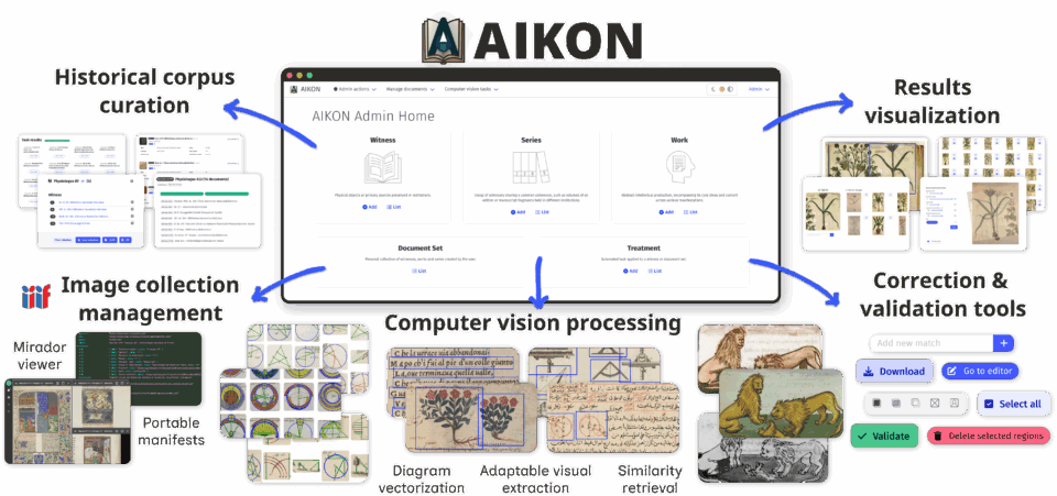 AIKON est une plateforme modulaire de vision par ordinateur destinée aux historiennes et historiens pour constituer, traiter et analyser à grande échelle des corpus visuels. Elle accompagne les utilisateurs tout au long du flux de travail, de la construction du corpus à la validation des résultats, sans nécessiter de compétences techniques. Fondée sur les standards IIIF et un modèle de données flexible, AIKON favorise la recherche collaborative tout en laissant aux chercheurs et chercheuses le contrôle des traitements automatiques. Sa modularité permet l’intégration de nouveaux algorithmes et outils de visualisation adaptés à l’analyse de documents historiques.